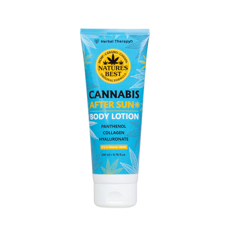 Jemné mléko po opalování s konopným olejem a panthenolem pro regeneraci podrážděné pokožky.
