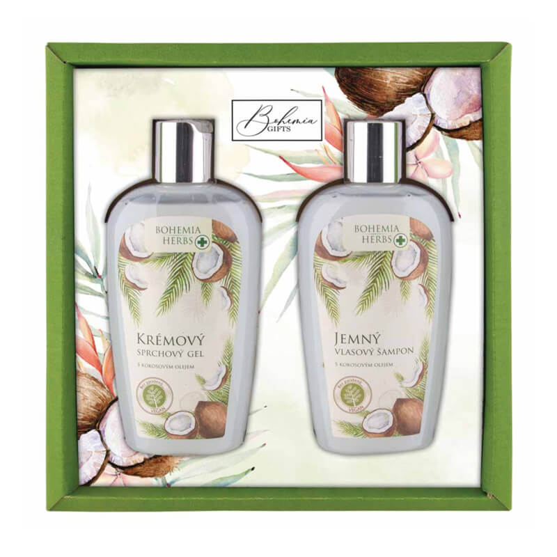 Bohemia Herbs Kosmetický balíček s kokosovým olejem gel 250 ml a šampon 250 ml je krásný dárek pro každou ženu. Kosmetický balíček obsahuje sprchový gel 250 ml a vlasový šampon 250 ml s kokosovým olejem. Sprchový gel s kokosovým olejem 250 ml je obohacen o kvalitní kosmetický olej ze semen kokosovníku ořechoplodého (Cocos nucifera, Arecaceae) a olej z plodů olivovníku evropského (Olea europaea). V kombinaci s kvalitními mycími složkami receptury vznikl přípravek s jemným působením na pokožku. Bohatá pěna šetrně myje a zanechává vaši pokožku svěží a krásně provoněnou. Vlasový šampon s kokosovým olejem 250 ml je jemný vlasový šampon vhodný pro všechny druhy vlasů. Speciální složení přispívá k vysoce kvalitní péči o vlasy, hygieně pokožky a její vitalitě. V přípravku je kvalitní kosmetický olej ze semen kokosovníku ořechoplodého (Cocos nucifera, Arecaceae) a olej z plodů olivovníku evropského (Olea europaea), které s dalšími ošetřujícími složkami přispívají k šetrnému mytí vlasů i vlasové pokožky a napomáhají udržovat je přirozeně hebké a jemné.